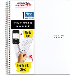 Wirebound Notebook meets all your note-taking and homework needs. Scan, study and organize your notes with the Five Star App. Create instant flashcards and sync your notes to Google Drive to access them from any device. Five-subject notebook has 100 double-sided, college-ruled sheets that fight ink bleed and are perforated for easy tear-out. Sheets measure 8-1/2" x 11" when torn out. Tough pockets prevent tears and hold loose sheets and handouts. Covers are water-resistant to protect your notes. Spiral lock wire prevents snags on clothes and backpacks. Notebook is made with SFI certified paper. Remove reinforcement tape to recycle. |